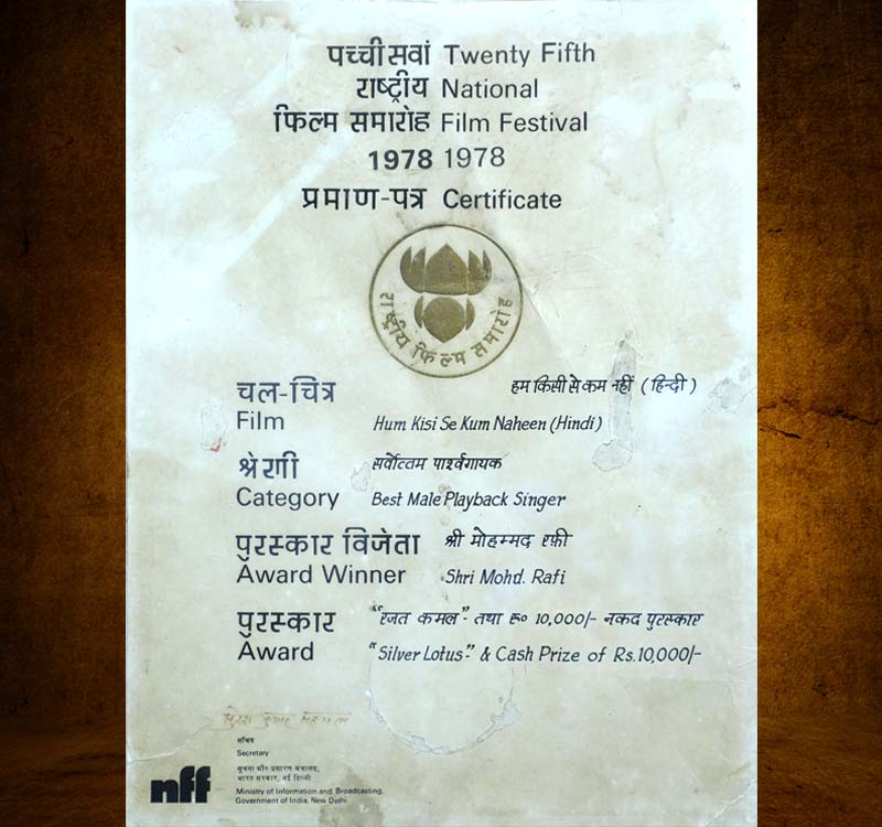 The list of his immortal songs is endless. He was nominated for Filmfare Award 21 times, out of which he came out winner on 6 occasions. It would be pertinent to note that though the Filmfare awards started in 1954, the award for playback singing was first initiated only in 1959. Until 1967 only one common award was given between male or female. It was only from 1967 separate winners were awarded in Male and Female categories. He was also the recipient of National Award in the year 1977.
