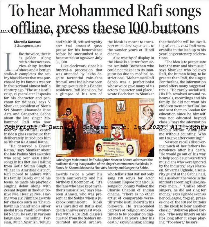 Complete recording of a function held at Shanmukhananda Auditorium on the occasion of his 43rd Barsi and inaugurating the kiosk containing his full size and bust line statue along with pavilion of his life story and musical audio gallery consisting of his 100 top songs.