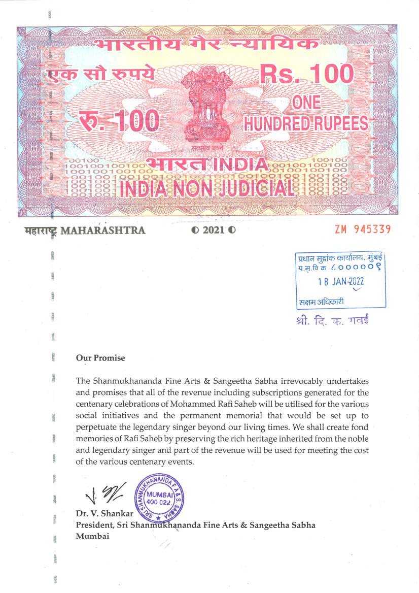 Shanmukhananda Fine Arts and Sangeetha Sabha, irrevocably undertakes and promises that all of the revenue including subscriptions generated for centenary celebrations of Mohammed Rafi Saheb will be utilized for the various social initiatives and the permanent memorial that would be set up to perpetuate the legendary singer beyond our living times. We shall create fond memories of Rafi Saheb by preserving the rich heritage inherited from the noble and legendary singer and part of the revenue will be used for meeting the cost of the various centenary events.